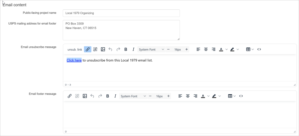 - Email unsubscribe message (Optional: customize the unsubscribe message for emails sent from the project.)