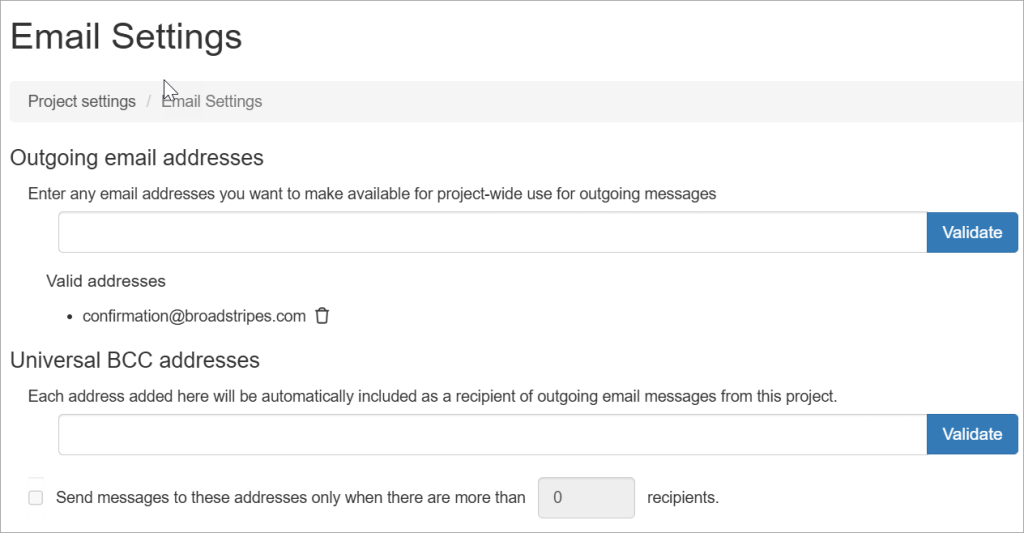 Project admins may validate default email addresses for general use in the project. The domain of the emails that are used must be authenticated with our email provider. To authenticate your domain or for more information, please reach out to support@broadstripes.com