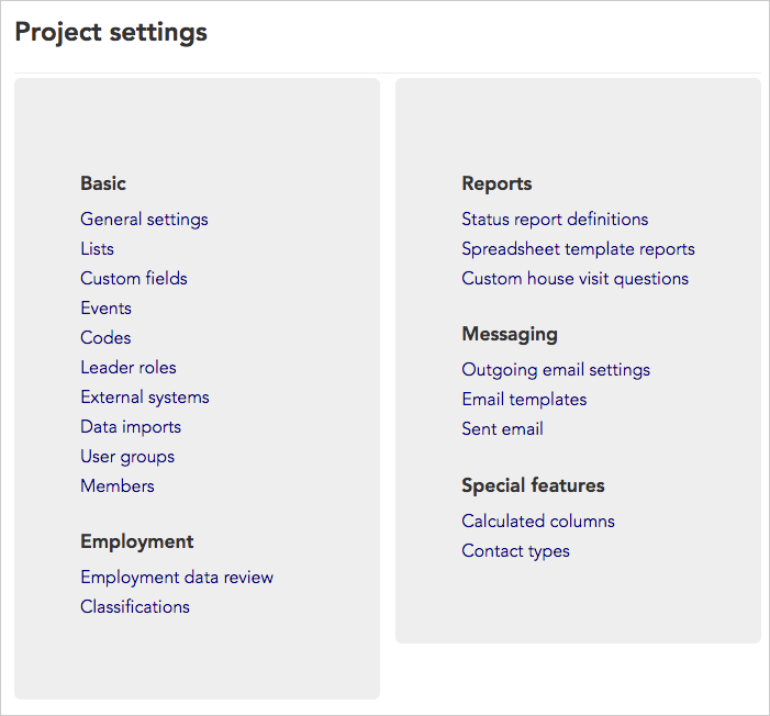 As the admin of your Broadstripes project, you may find that you have a lot of information you want to keep track of – data imports, custom fields, report formats, and user permissions, just to name a few. Thankfully, Broadstripes provides the tools you need to make your job more simple. One tool you should know about is the Project settings page – a single access point for all of your admin tools. In the upper right corner of any page, click Settings>All settings to open the Project settings page.