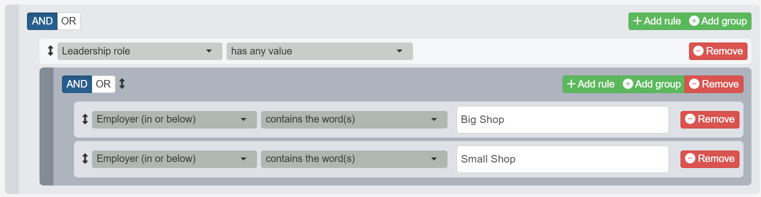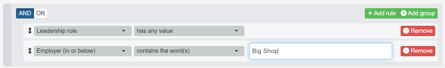 You may remember that we built a multiple-rule search for “people who are leaders at Big Shop” in a previous help article. Imagine that you now need a similar search that will find leaders at either “Big Shop” or “Small Shop”. The rules in this search might be stated this way:Find people who…