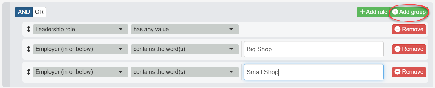 - Now we need to create a group for our rules about employment since we want Broadstripes to search for people who are leaders at either “Big Shop” or “Small Shop” (not both).
