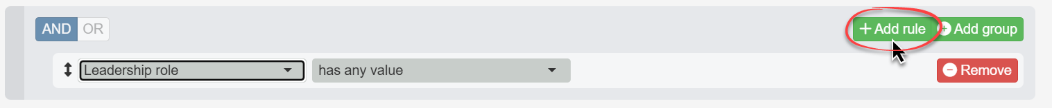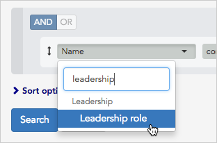 - To search for leaders, we’ll select “Leadership role” from the drop-down list on the left just as we did in the Search with multiple rules article.