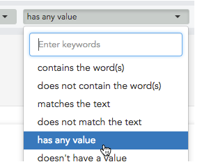 - In the middle drop-down box, we’ll choose “has any value” to see everyone with a leadership role.