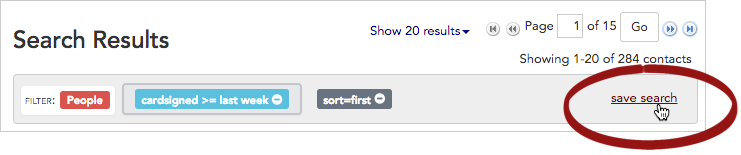 In this example, we’ll save a search and share it with another organizer, Jane.- Start by running a search. From the Search Results panel, click the “save search” link in the upper right corner of the page.