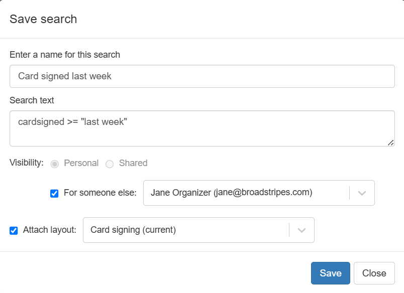 - Share it with a specific user (select For someone else, then type the user’s name). Note that when you save for someone else, it will only appear in that designated user’s list. If you want a copy of the search for yourself, save it first as a personal search, then repeat the process and choose to save it for that other user.