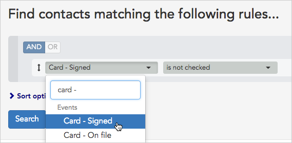 - Since we want to limit our search to workers who haven’t yet signed a card, we’ll set that up first. We’ll do the search based on an event in our project called “Card” to find all the people who have a certain status for the event step “Signed.” From the left-hand drop-down menu in the search builder, we’ll choose the Card - Signed step under the Events section of the menu.