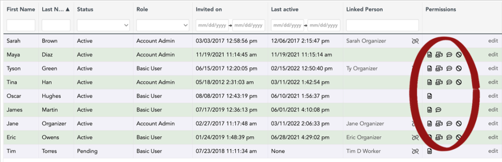 - On this page, their permissions and roles are also visible and you can hover over any icon to see a more detailed description of permissions granted.