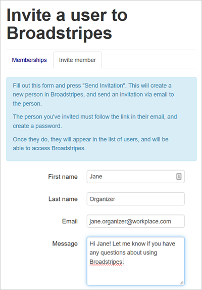 - Click the Send invitation button, and the person you are inviting will receive an email from Broadstripes with a link to set a password.