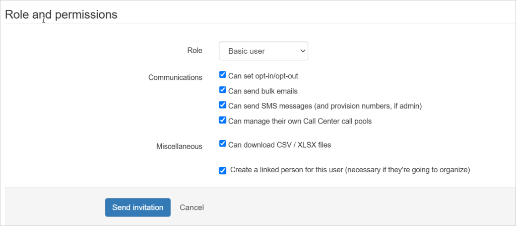 - Choose the user’s role and permissions from the drop-down menu at the bottom of the page. If you need an explanation of the different roles and permissions Broadstripes offers to users, or if you have questions about whether to check the “Create a linked person” checkbox, take a look at the ”(#ftoc-heading-7)” section below.