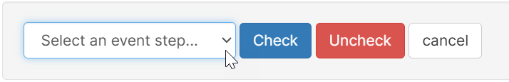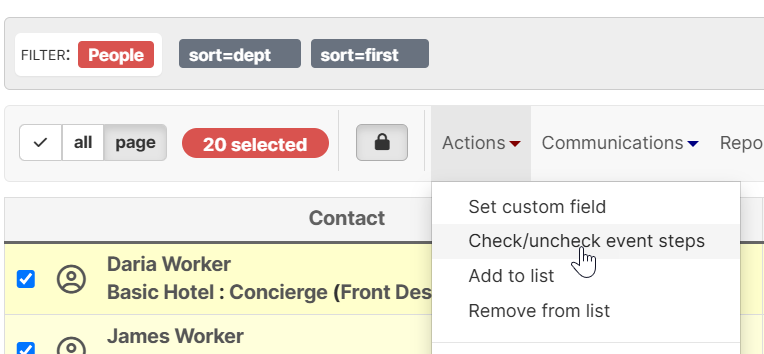 - With the contacts selected, we’ll go to the Actions drop-down menu and choose Check/uncheck event steps.