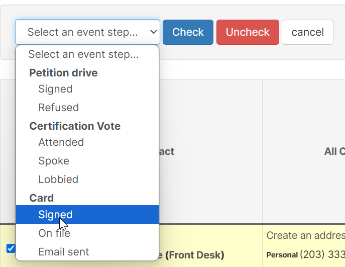 If you want to uncheck (rather than check) an event step for a group of contacts all at once, you can do that from the actions drop-down menu, too. In this example, we have a list of people who were accidentally marked as having signed cards. We need to correct their records to show that they haven’t yet signed a card.- Again, we’ll start by running a search. From the Search Results page, we’ll select the contacts we need to correct. (If you need help running a search, check out theSearch articlesarticle.)