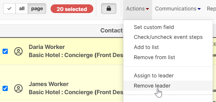 - With those contacts selected, we’ll go to the Actions drop-down menu and choose Remove leader.