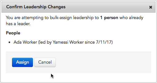 If any of the selected workers were previously assigned to a leader, Broadstripes will ask you to Assign (confirm) or Cancel the new leadership assignment.