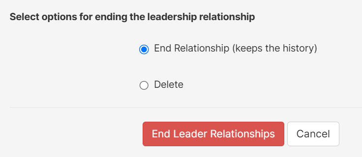 - Choose Delete if you want to completely erase the leadership relationship and any history of it (for instance, if Mary was assigned in error).