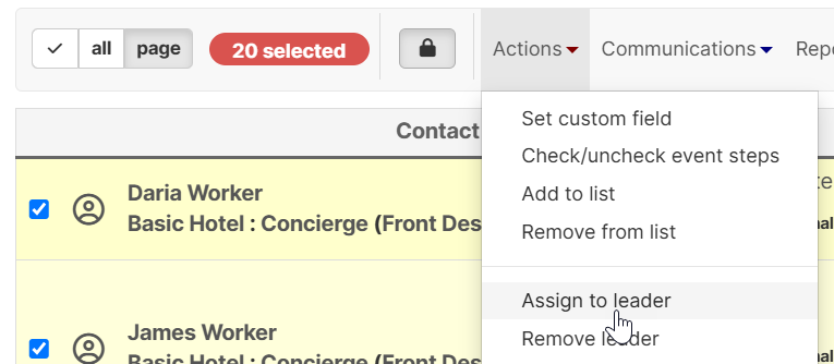 - With the contacts selected, go to the Actions drop-down menu and choose Assign to leader.