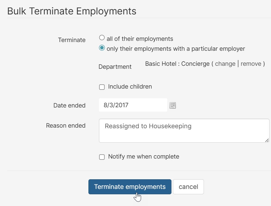 We’ll choose a specific employment (Basic Hotel : Concierge), enter the termination date, and give a brief explanation of why the employment ended. If this employment had child records, we could choose to terminate those as well by checking the Include children checkbox.