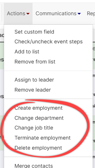 - With the contacts selected, we’ll go to the Actions drop-down menu and choose Delete employment.