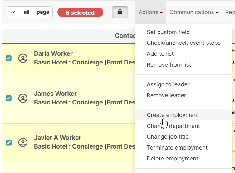 - With the contacts selected, we’ll go to the Actions drop-down menu and choose Create employment.