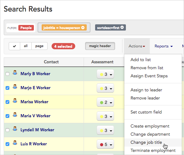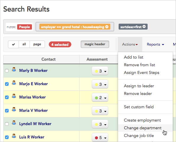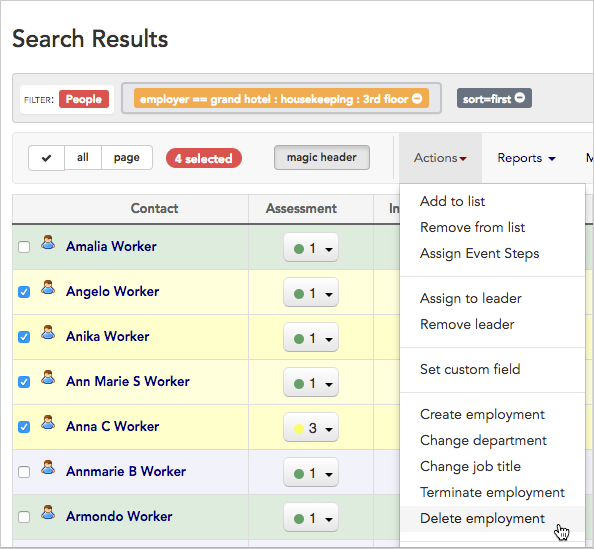 If you want to terminate an employment for a group of contacts at one time, you can do that from the actions drop-down menu, too. A record of any terminated employment will be visible on the Employment tab of each worker’s profile page. In this example, we will terminate an employment for three workers who are no longer working in Housekeeping on the second floor of the Grand Hotel.- Again, we’ll start by running a search. From the Search Results page, we’ll select the workers whose employments we need to terminate. (If you need help running a search, check out the Search articles)