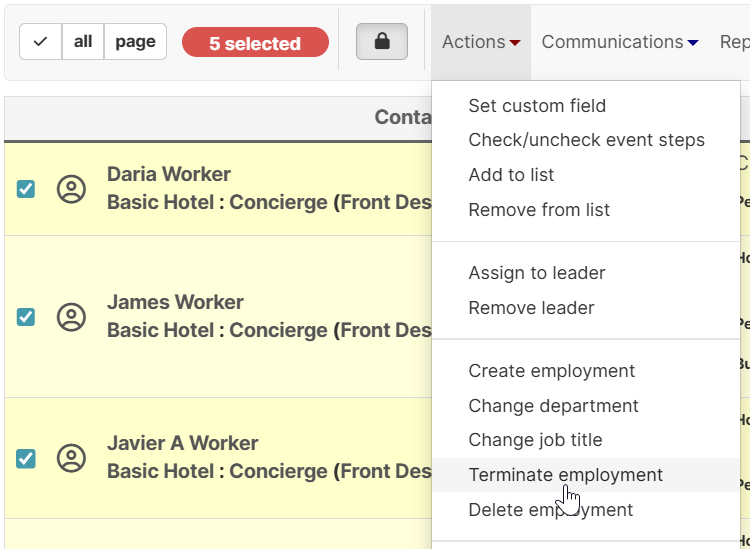 - With the contacts selected, we’ll go to the Actions drop-down menu and choose Terminate employment.